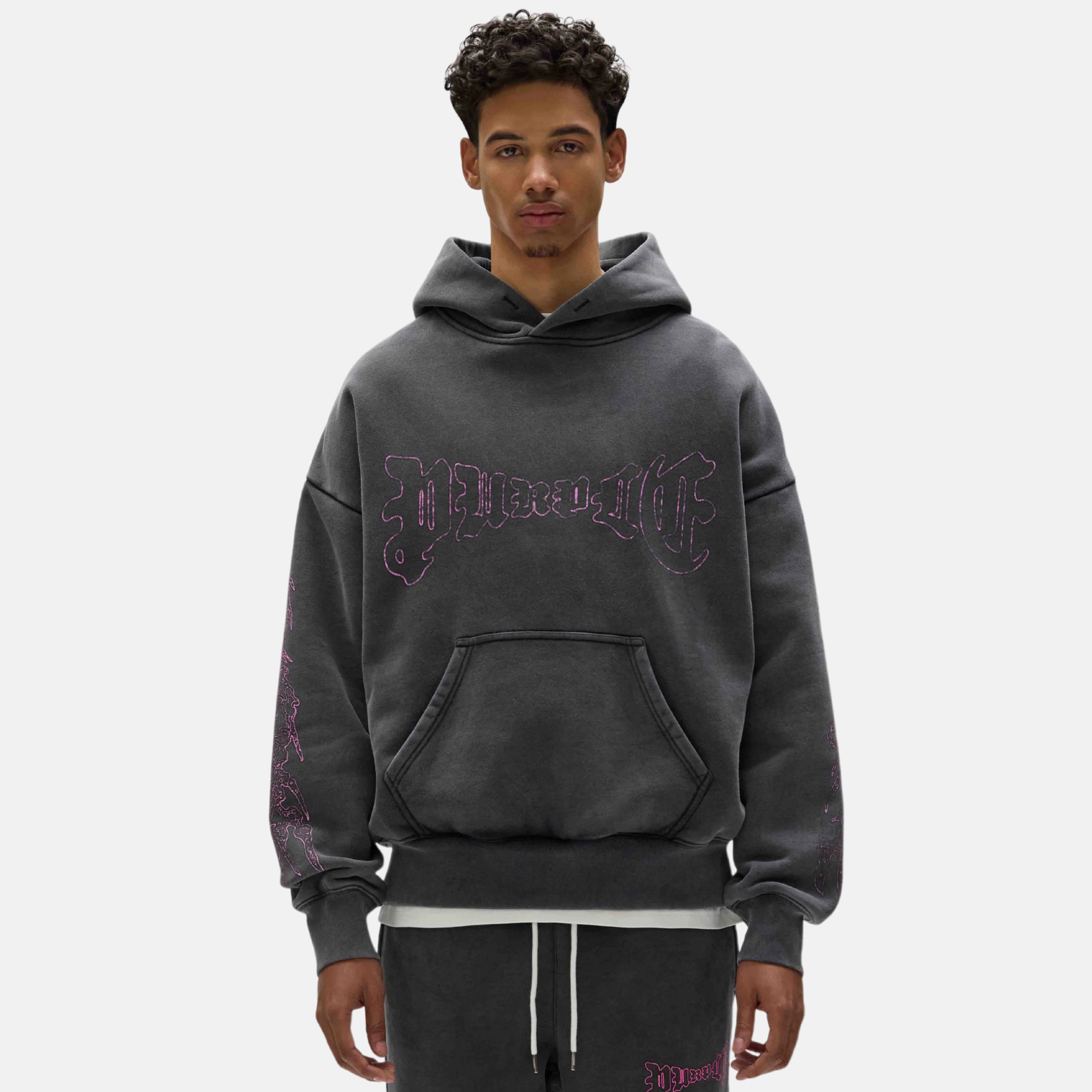 This hoodie is made from acid-washed heavyweight cotton fleece with gothic Purple brand lettering at the chest and both arms, featuring a crackle finish. It’s designed for an oversized fit with drop shoulders, a kangaroo pocket and ribbing at the cuffs and hem.