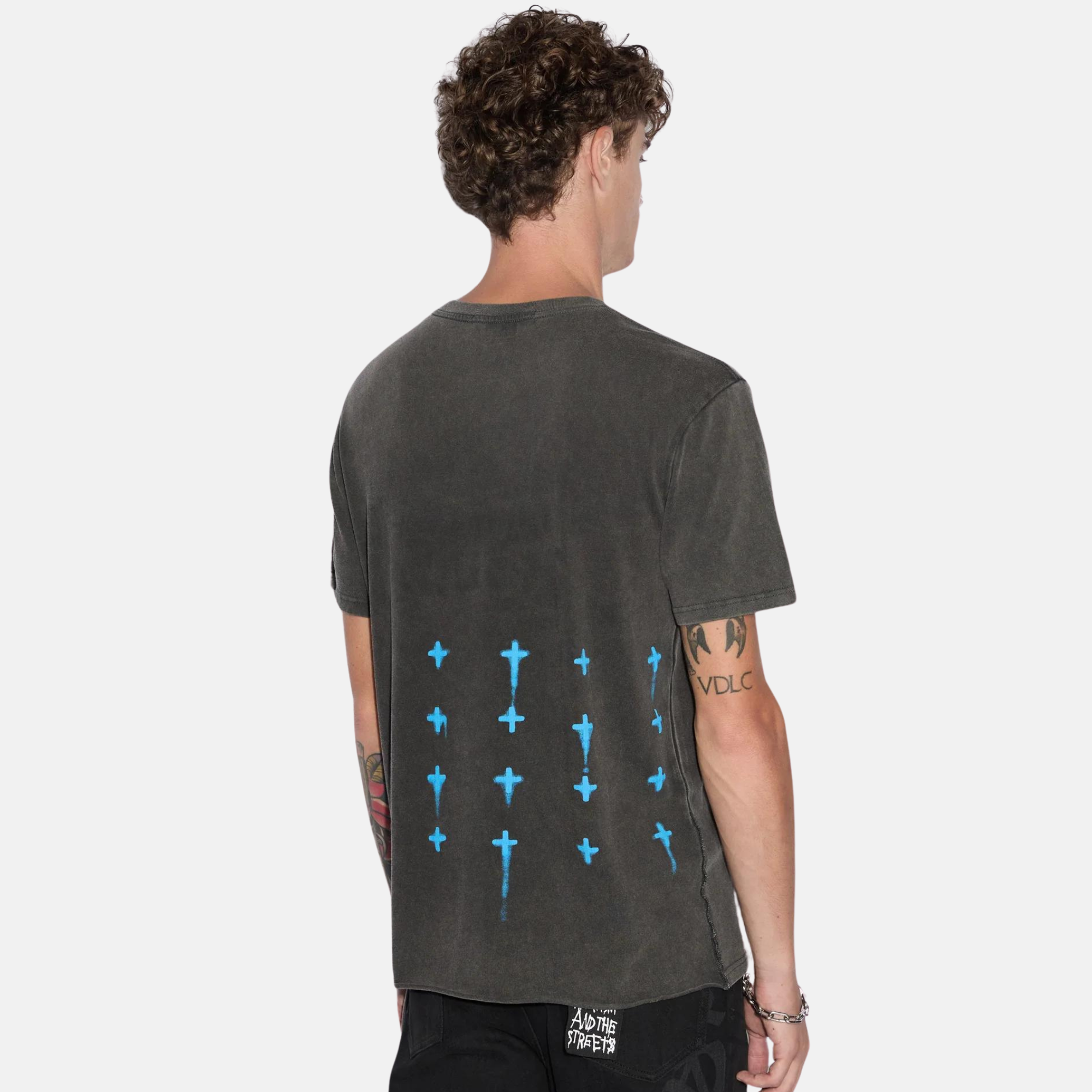 The Graff Rose Kash Ss Tee Acid Grey is made from a black cotton jersey treated with an acid wash for a vintage look. This regular fitted tee has short sleeves, a crew neckline and the signature rats tail. The front features a custom Ksubi logo rose artwork and a matching bue drip 4x4 on the back.