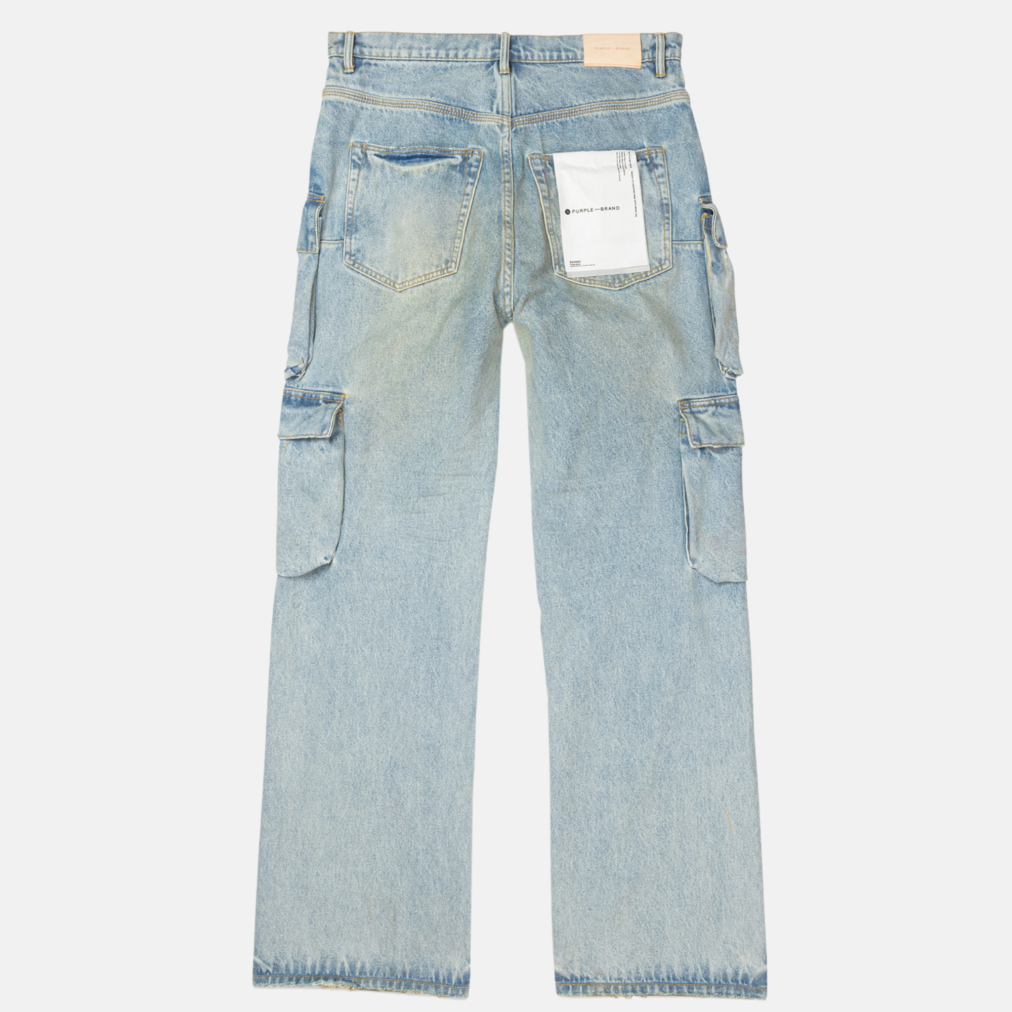 Crafted from premium stretch denim in a light indigo wash, this mid-rise relaxed fit is faded by hand. The style is detailed with double cargo pockets at each leg, reinforced belt loops for extra durability, chambray lining for a more comfortable fit, bar-tack stitching, a custom Purple cowhide leather patch and signature hang tag branding.
